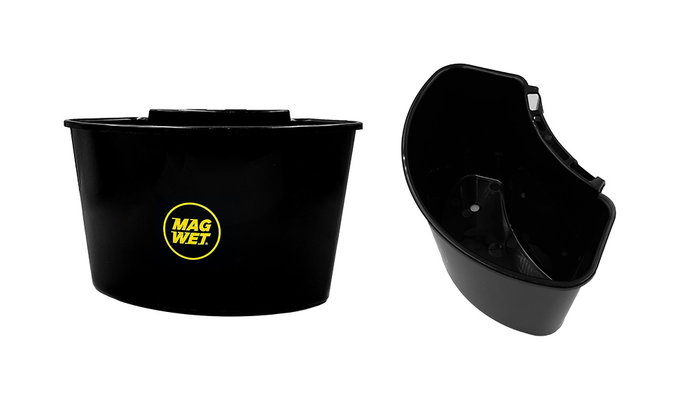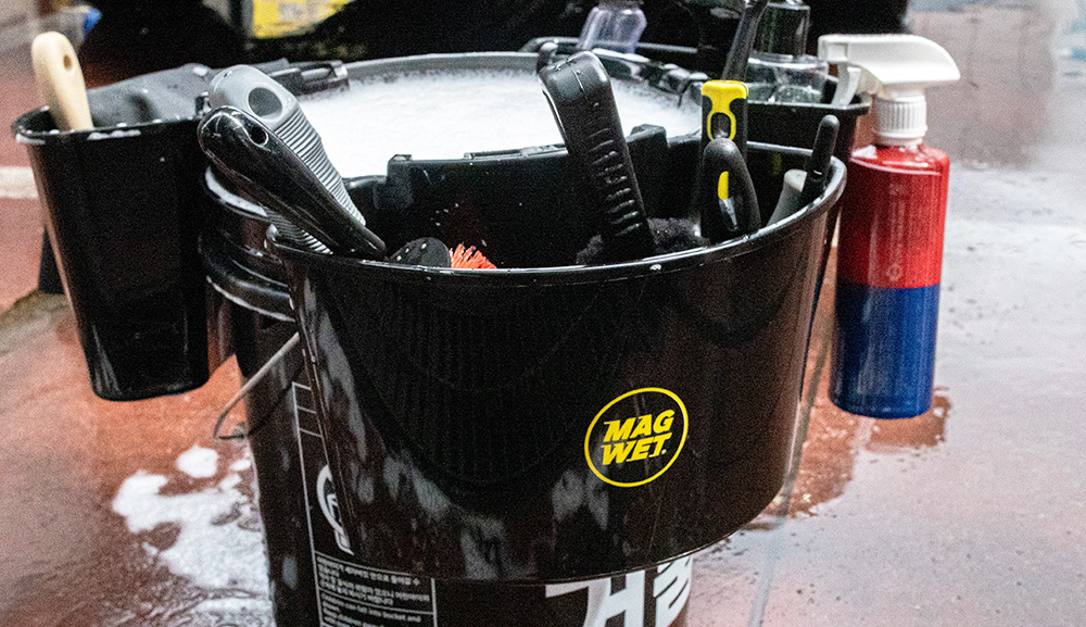 Box attached to the side of the bucket for easy storage of wash mitts, brushes, and other car wash items